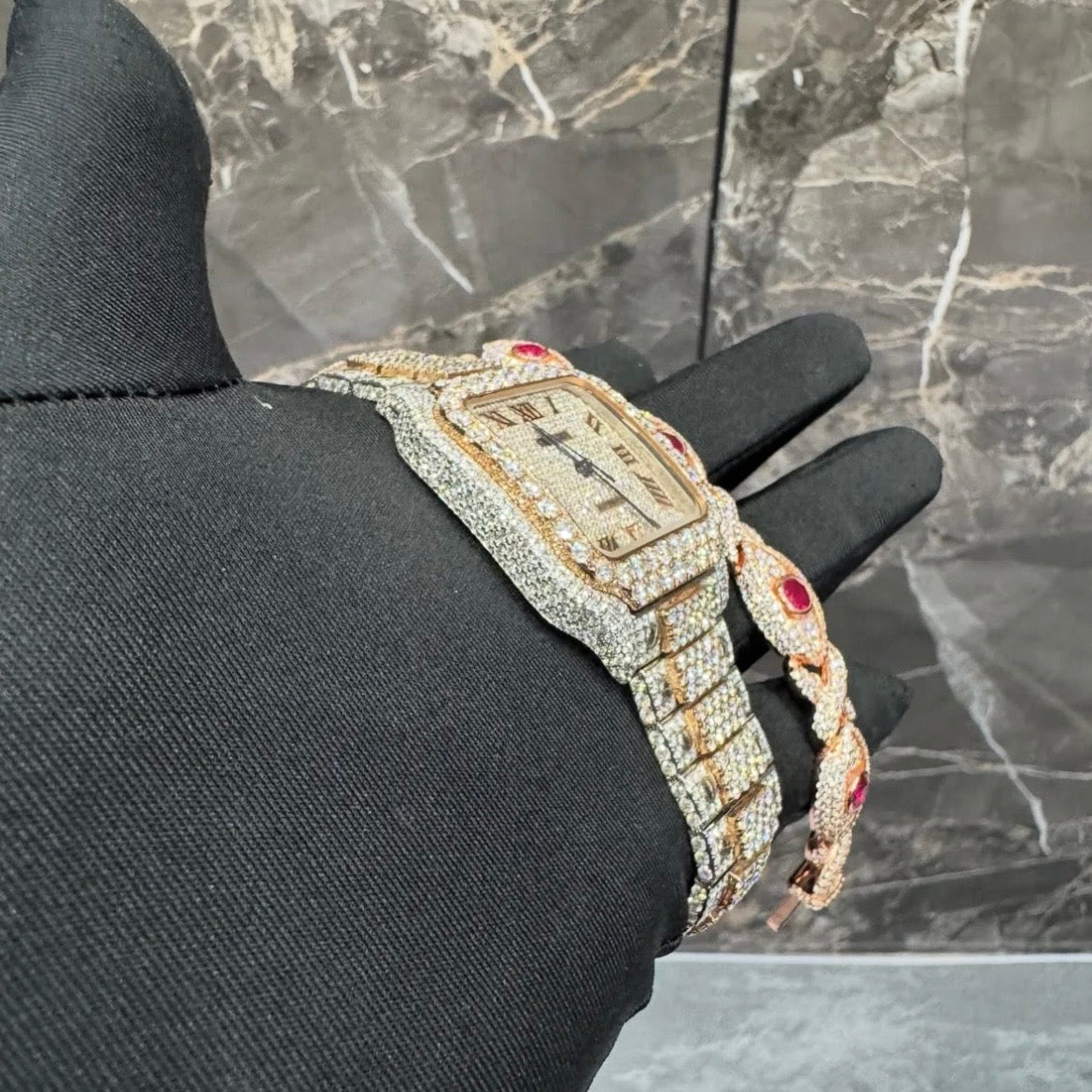 Whether inspired by the iconic Cartier Santos or Cartier Tank, this piece keeps its signature clean lines and Roman numeral styling, now reimagined with a bold, diamond-covered finish that catches light from every angle.